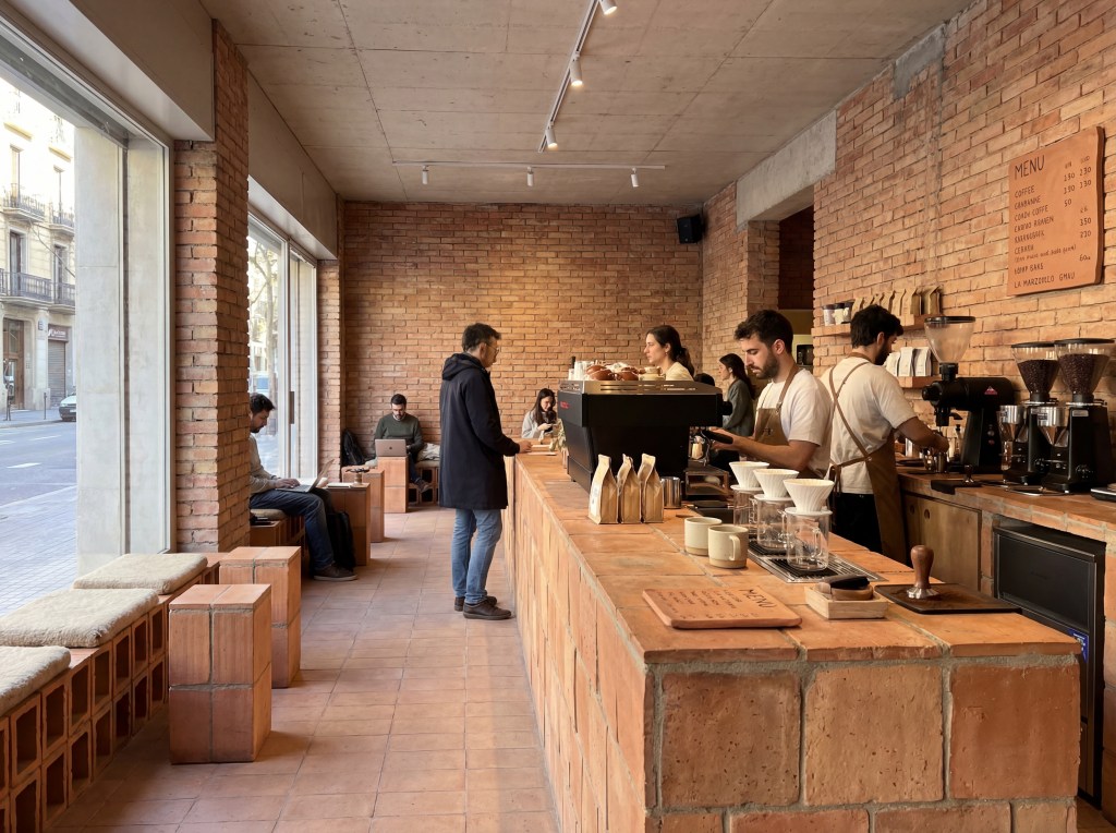 Proyecto de adecuación de local para cafetería de especialidad, desarrollado a partir del uso casi exclusivo de piezas cerámicas como material constructivo y acabado.
