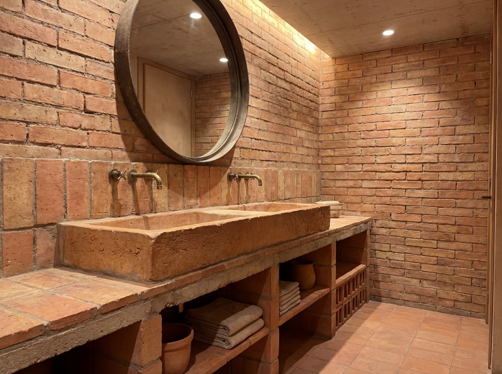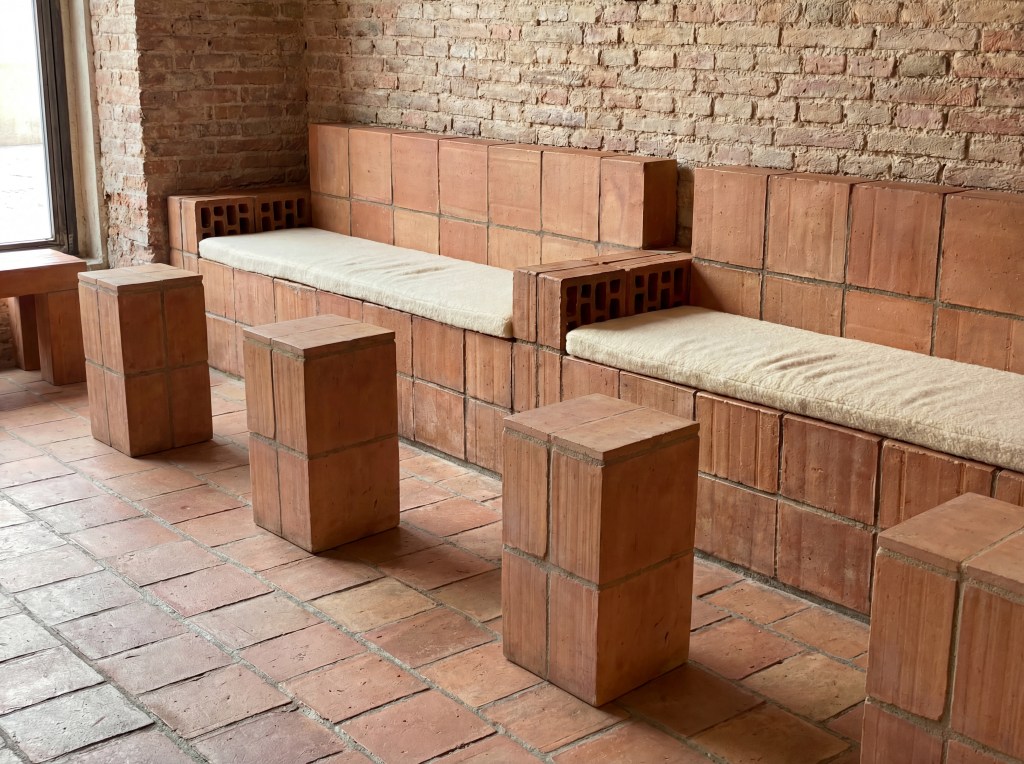 El espacio se articula mediante elementos de obra ejecutados con ladrillo macizo, configurando tanto la barra principal como los bancos corridos y apoyos, que pasan a formar parte de la propia arquitectura interior. Esta continuidad material permite resolver el mobiliario desde una lógica constructiva, evitando la incorporación de piezas exentas.