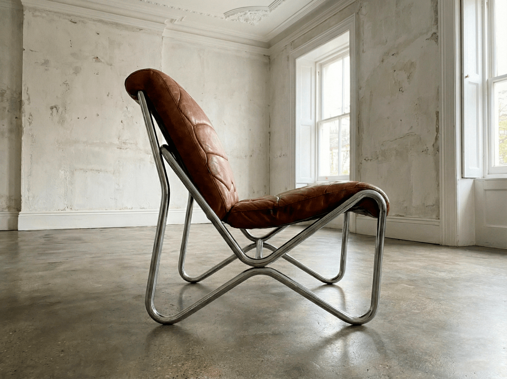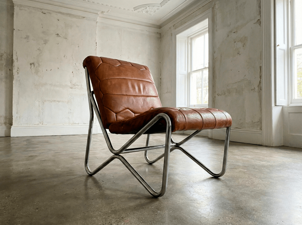 El resultado es una butaca lounge de fuerte presencia tectónica, donde el brillo industrial del chasis metálico contrasta con la calidez matérica de la piel envejecida, logrando un equilibrio entre memoria histórica y sobriedad contemporánea.