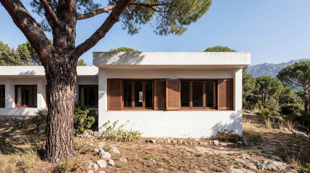 El proyecto se desarrolla en una única planta, desplegándose longitudinalmente sobre el terreno para establecer una relación directa y continua con el exterior. La volumetría es rotunda y contenida: planos blancos enfoscados, cubierta plana y huecos regulares protegidos mediante carpinterías y celosías de madera.