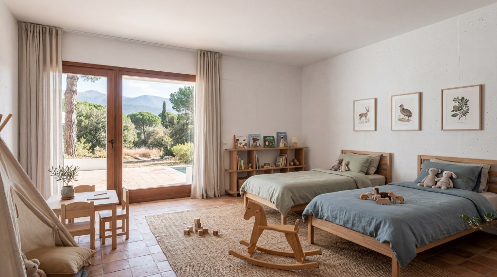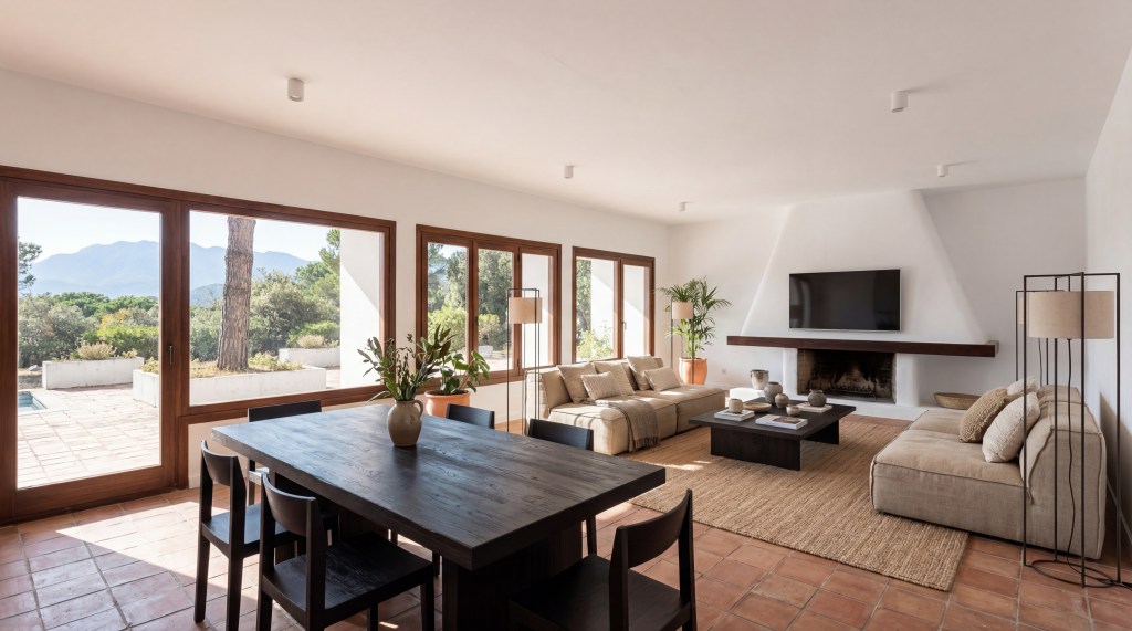 La zona de día se concibe como un único espacio continuo que integra cocina, comedor y estar en relación directa con la terraza y la piscina, mientras que las estancias privadas se disponen con mayor recogimiento, manteniendo siempre el vínculo visual con el paisaje de pinos.