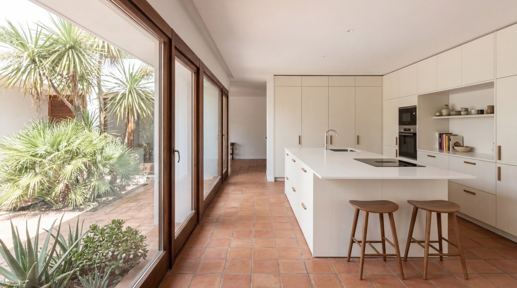 El espacio interior se organiza a partir de una secuencia lineal de estancias abiertas al jardín, donde el suelo continuo de baldosa cerámica de barro cocido actúa como elemento unificador y refuerza la conexión con el exterior. La luz natural entra de forma controlada, filtrada por las celosías y la vegetación, generando un ambiente cálido y cambiante a lo largo del día.