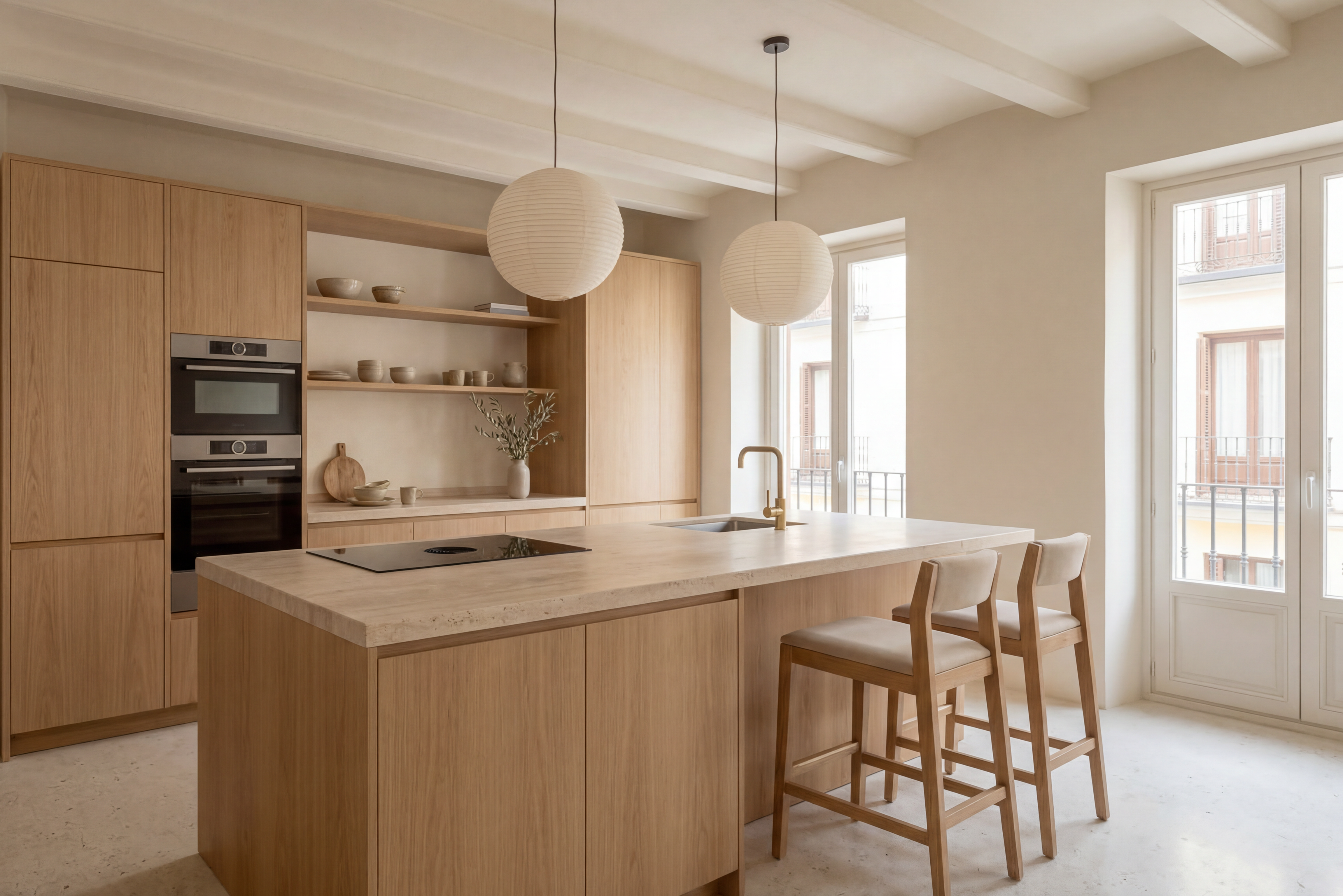 La vivienda se reorganiza a partir de un espacio principal continuo que integra cocina, comedor y estar, favoreciendo la entrada de luz desde fachada y su recorrido a lo largo de toda la planta. La cocina se resuelve mediante un sistema de mobiliario en madera natural y una isla central en piedra clara, que actúa como pieza estructuradora del espacio doméstico.