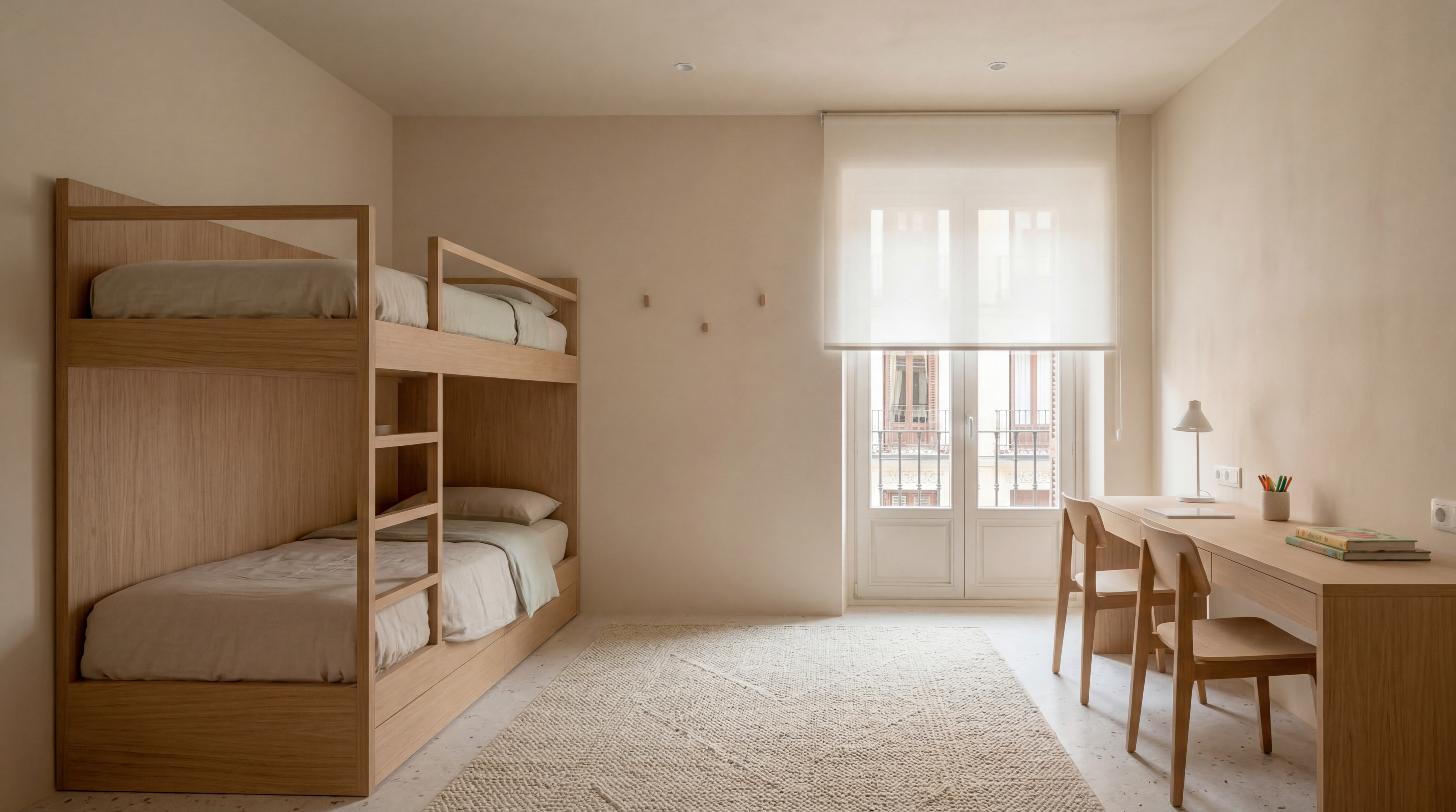 En las estancias privadas se mantiene el mismo lenguaje, con soluciones integradas de almacenaje y una paleta reducida que refuerza la continuidad del conjunto. Elementos puntuales, como el alicatado cerámico en zonas húmedas, introducen contraste sin romper la unidad material.