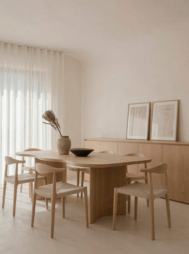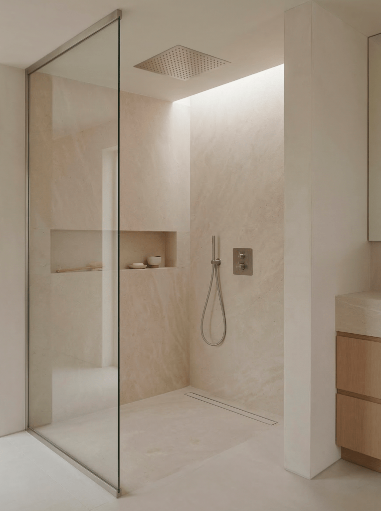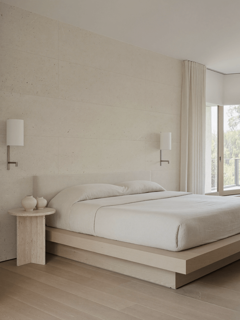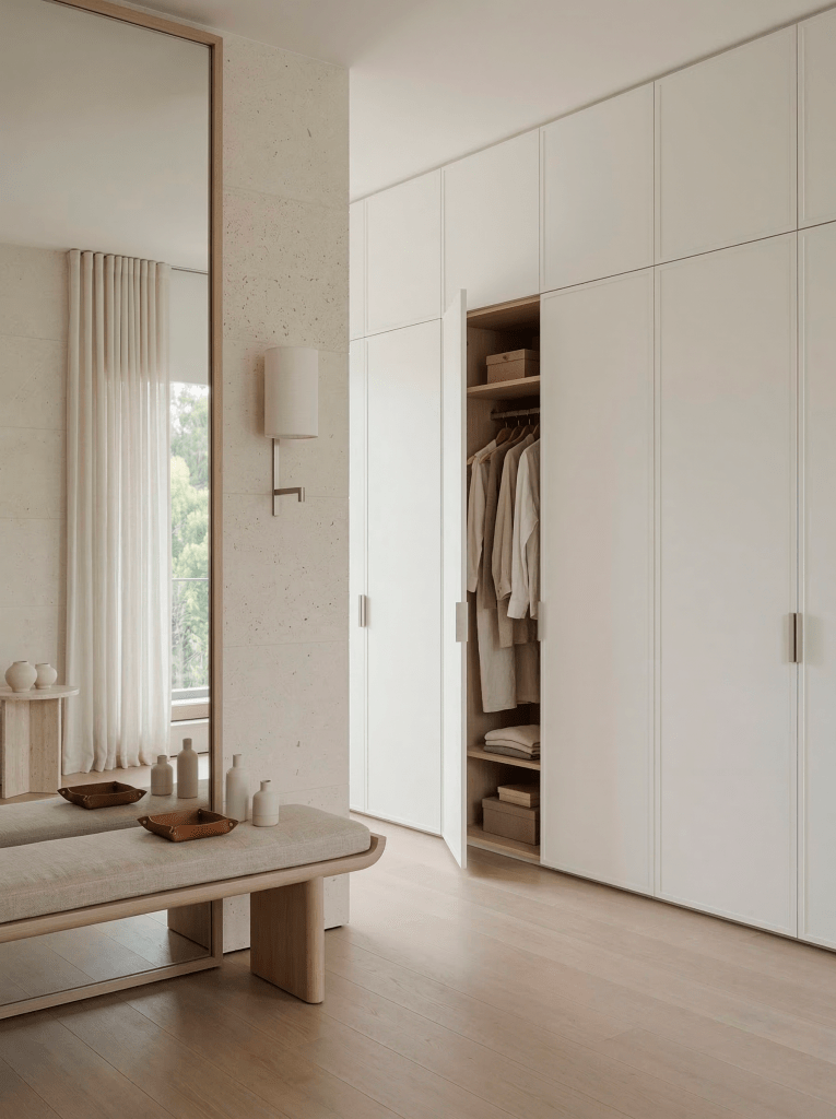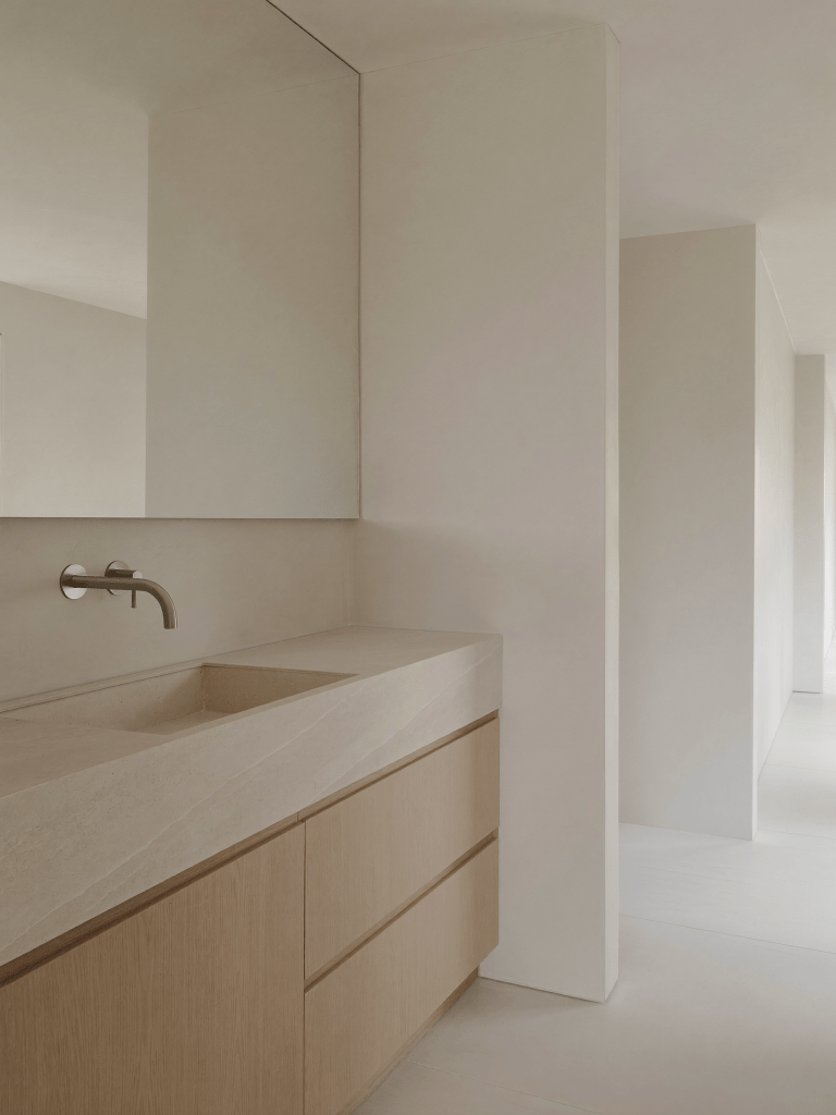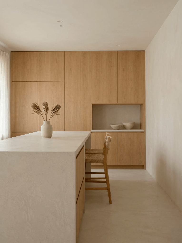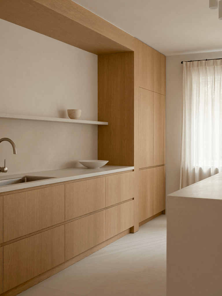 La vivienda se organiza a partir de una paleta reducida de materiales —madera clara, piedra natural y acabados minerales— que se aplican de forma continua en todos los espacios. El mobiliario se integra en la arquitectura mediante piezas a medida que resuelven almacenamiento, cocina y elementos fijos, evitando la presencia de objetos independientes.