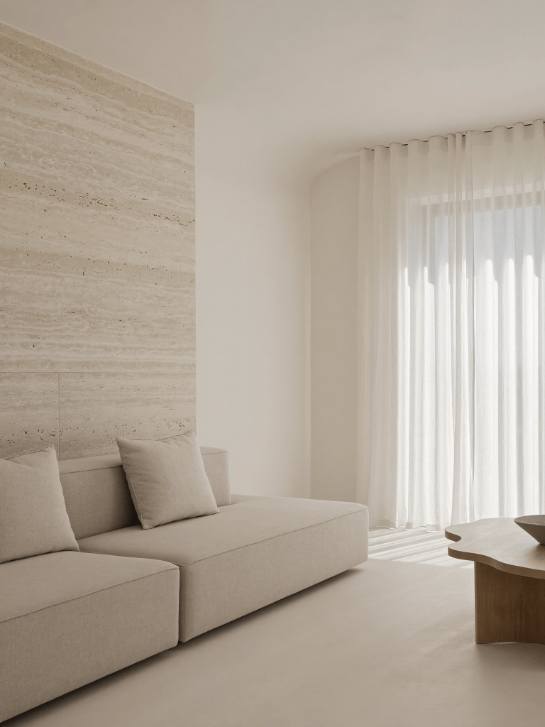 Los espacios se articulan mediante planos limpios y transiciones suaves, con especial atención a la entrada de luz natural, filtrada a través de cortinas ligeras que refuerzan la atmósfera doméstica. La intervención busca un ambiente sereno y homogéneo, donde proporción, luz y material construyen la identidad del conjunto.