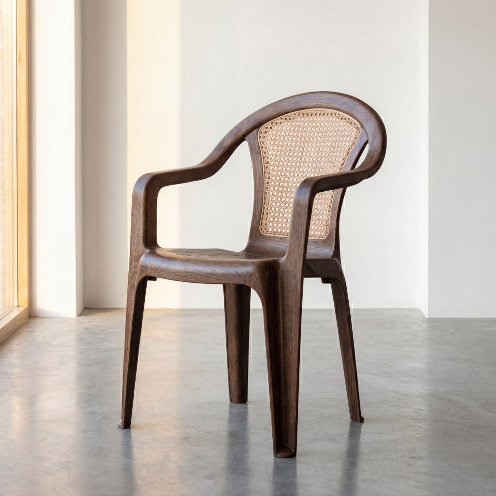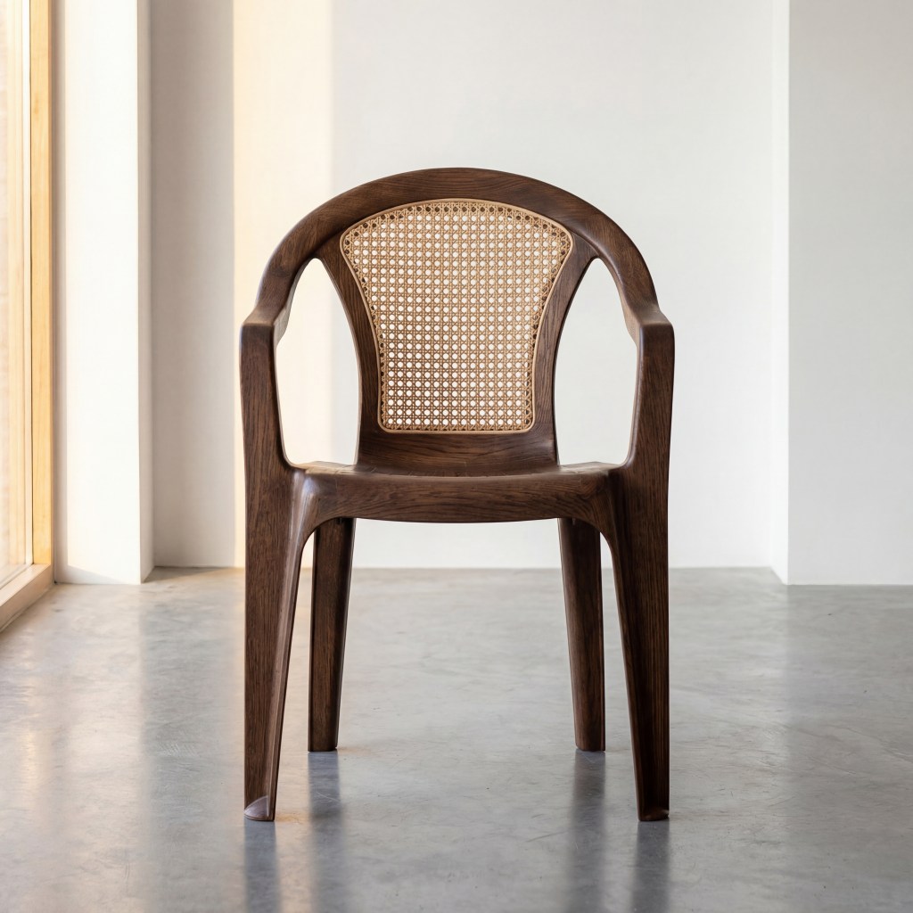 MonoblOAK propone una subversión técnica del arquetipo monobloque, trasladando la continuidad formal propia de los polímeros inyectados a la nobleza del roble macizo. El diseño se manifiesta a través de un cuerpo fluido y escultural que integra respaldo, asiento y apoyabrazos en una única lógica constructiva, eliminando las transiciones mecánicas visibles para enfatizar la veta continua de la madera. Este lenguaje de solidez se aligera mediante la inserción de un panel de rejilla tradicional en el respaldo, un gesto que no solo aporta transparencia visual y transpirabilidad, sino que establece un diálogo dialéctico entre la artesanía de fibras naturales y la manufactura avanzada.